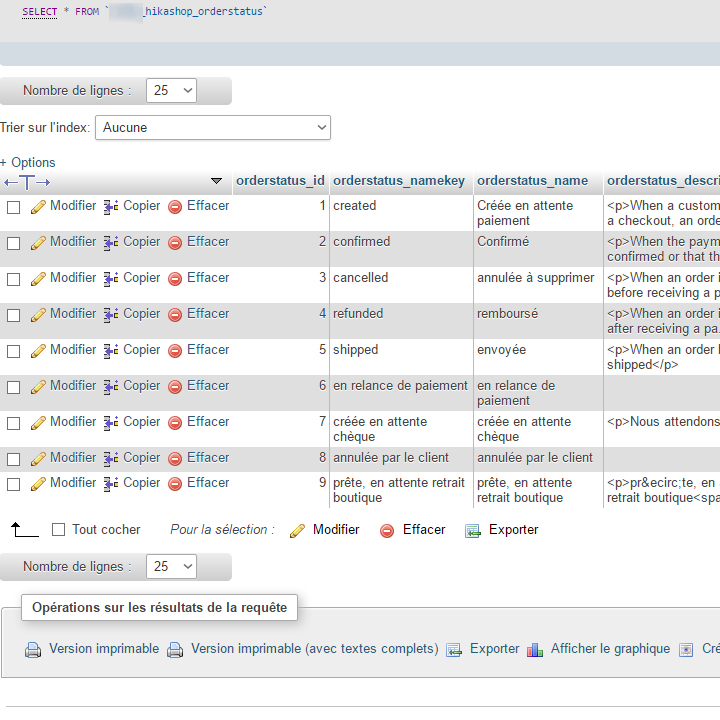 Au niveau du status ; merci de regarder la colonne "order_status" de la table "hikashop_order" ; vous y trouverez votre "status_1481096554_901948525".