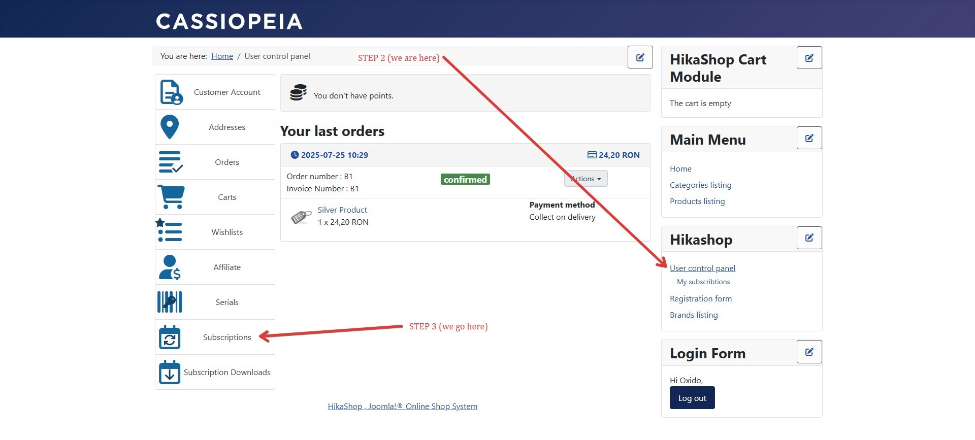 I've encountered an issue with the link to the Subscriptions section in the HikaShop user control panel.