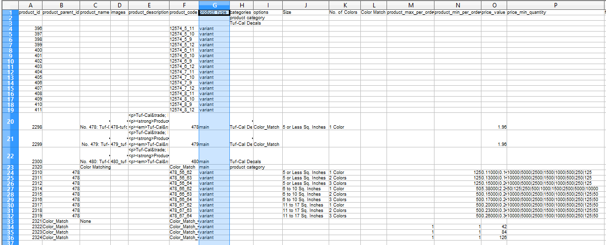 You can see that one product "478" on row 20 has several variants and also one option that has 4 variants also.