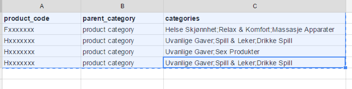 product_code Categories (structure) Product_name