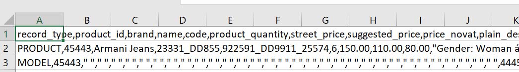 So column "record_type" = "product_type" and "PRODUCT" = "main" and "MODEL" = variant"