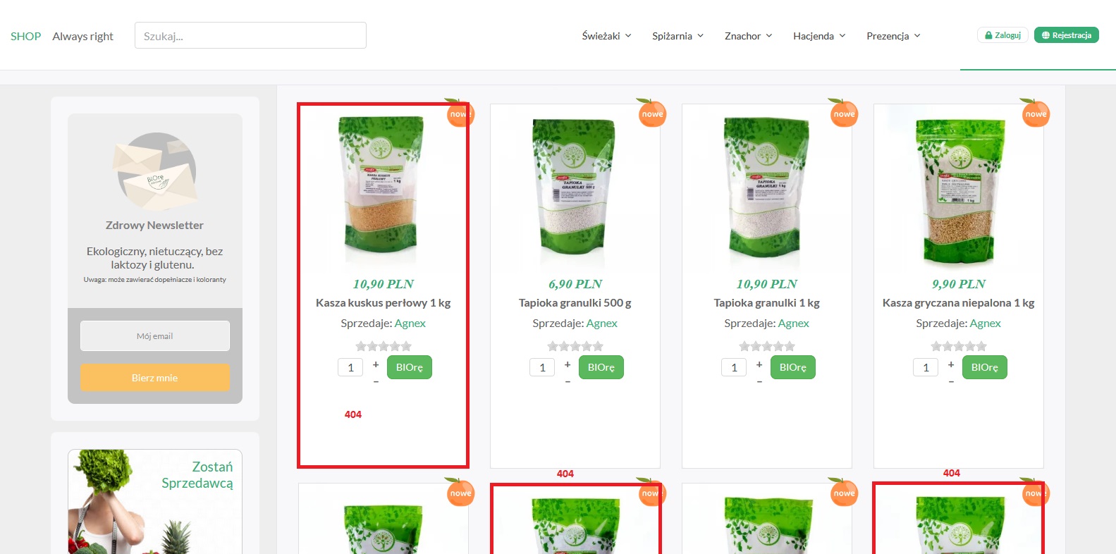 Then, when you click on the link on the listing, in order to know which product to load, the routing system can only base itself on the alias of the URL so, for example: "kasza-kuskus-perlowy-1-kg". It will try to search for a product with that alias, and if no product is found, it will try to look for a product with that name (replacing the - with spaces).