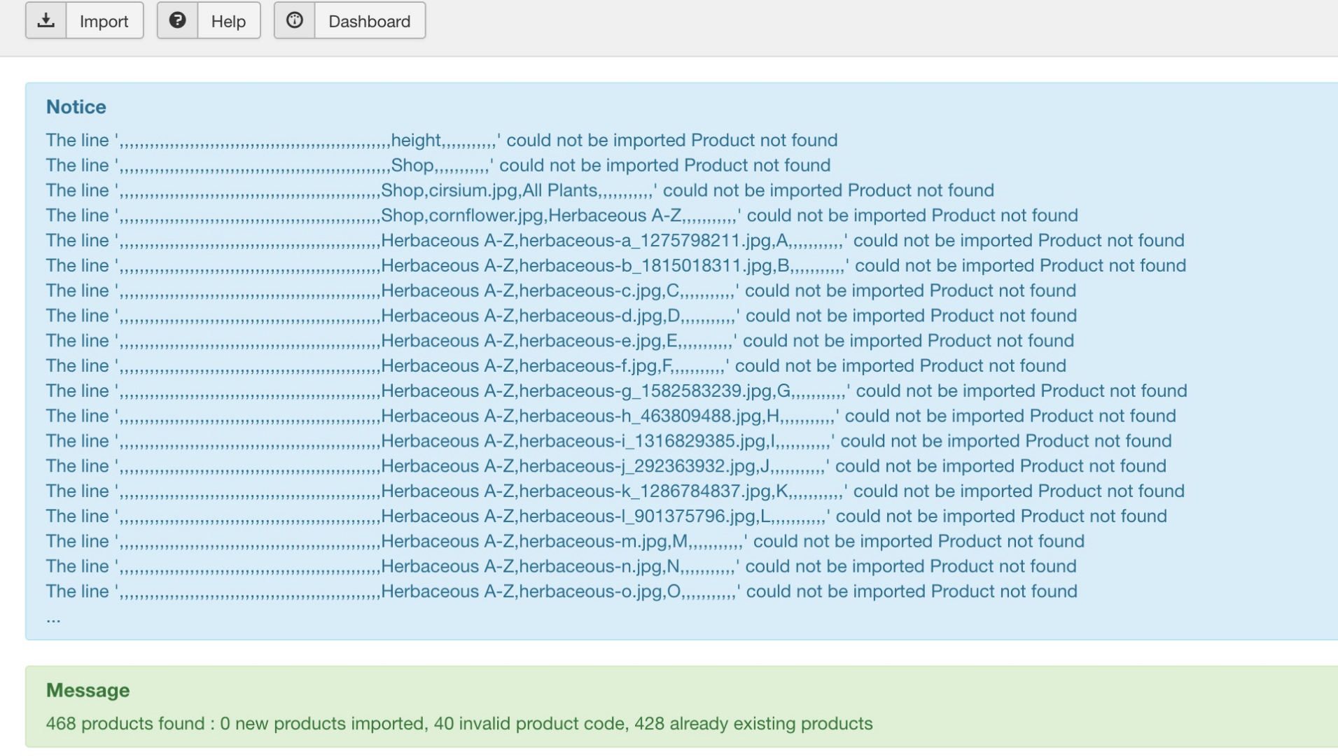 After I import from CSV file I get an on-screen "Notice" and "Message" after the import that reports various things that either worked or failed. Is there any way of seeing in more detail what has failed? Like what are to 40 invalid product codes? --See attached pic. Which column in the import CSV file is the product code? The text in the 'product_code' column looks ok (but with lots of '_' inserted). Since I did not generate this text could I delete all this column text and import again?