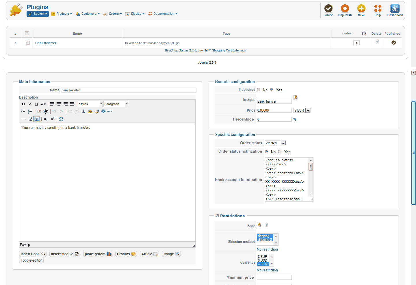 Hello. The thing is that: For payment I use "HikaShop bank transfer payment plugin". For delivery - "HikaShop manual shipping plugin". If more than 2 variants of delivery (for example: 1pc. - 2 rub; 2pcs. - 5rub.) then after order registration there is a message "thanks for the order" that's it! In the control panel of the order is not present both the message to the client and the administrator too is not present. If 1 variant of delivery, registration passes ideally - appears the message with bank details (which earlier filled in a plug-in) and messages are sent. How to implement 2 and more variants of delivery using only plugin "HikaShop manual shipping plugin"? In advance thanks!
