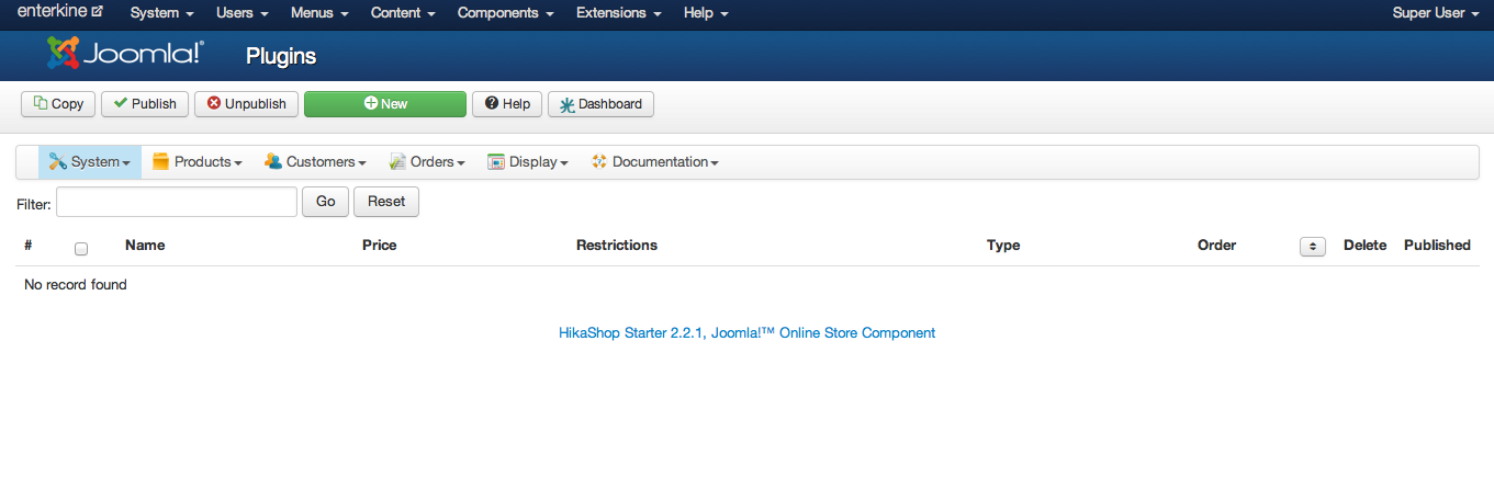 I have enabled several Hikashop plugins (shipping and payment) in the main joomla plugins folder, but when I select the Hikashop plugins folder to configure them I get the no records.