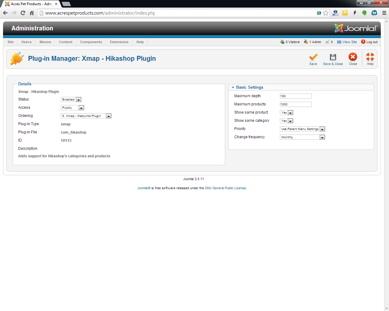 The Xmap - Hikashop Plugin is enabled and the Basic Settings are: