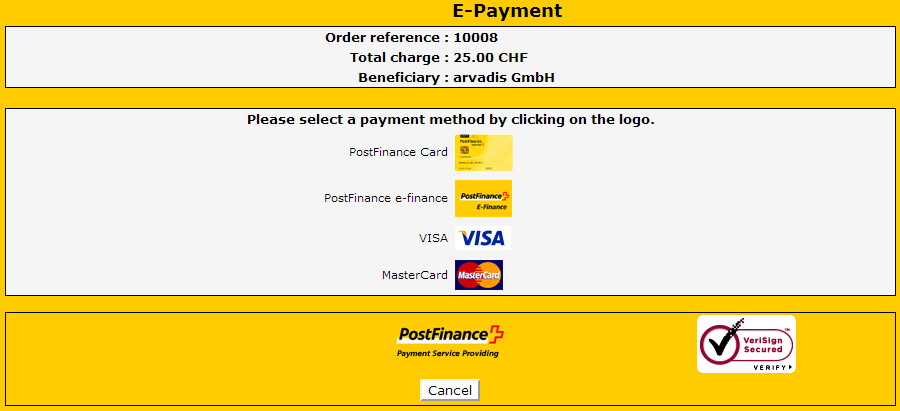 An error has occurred; please try again later. If you are the owner or the integrator of this website, please log into the PostFinance back office to see the details of the error.