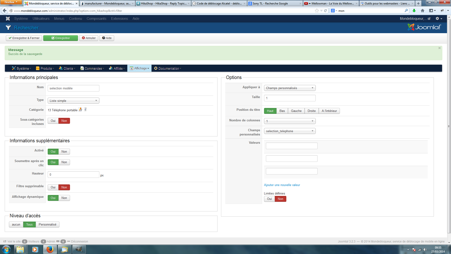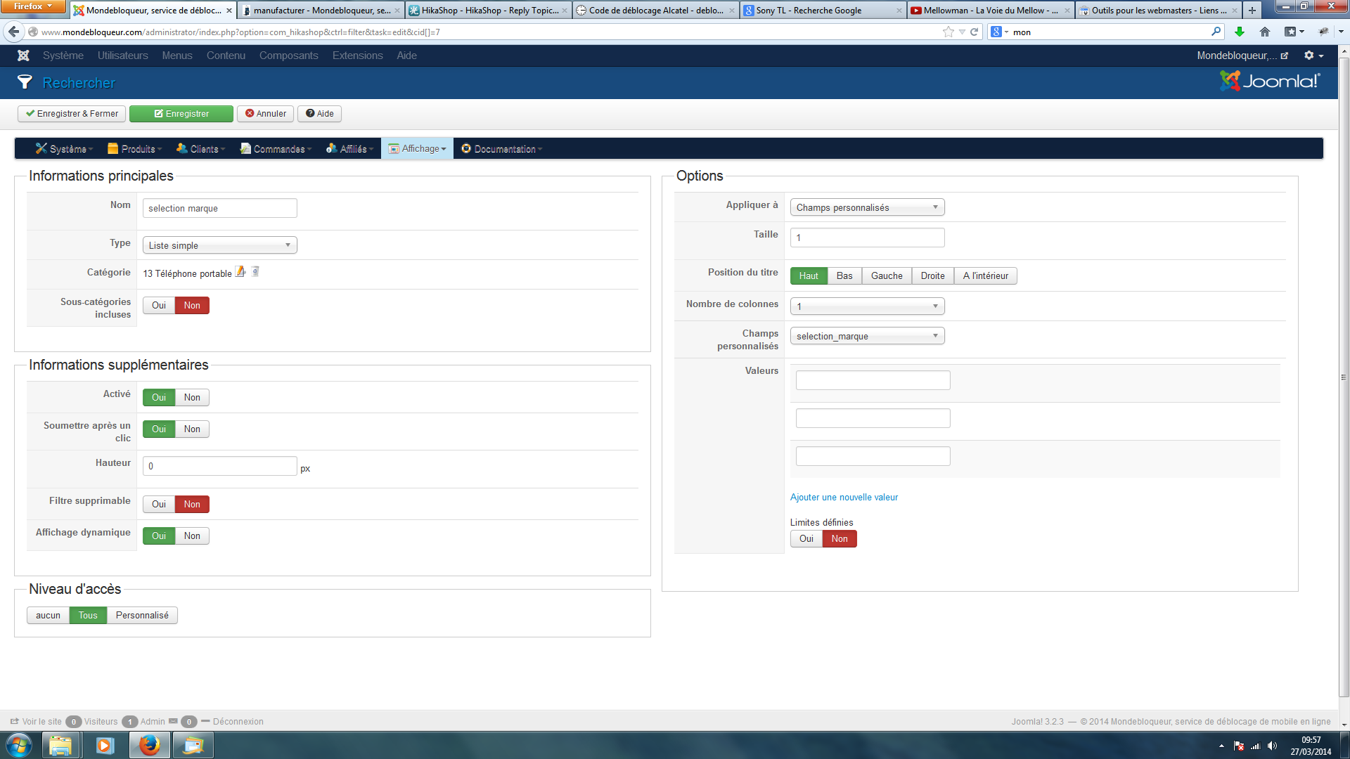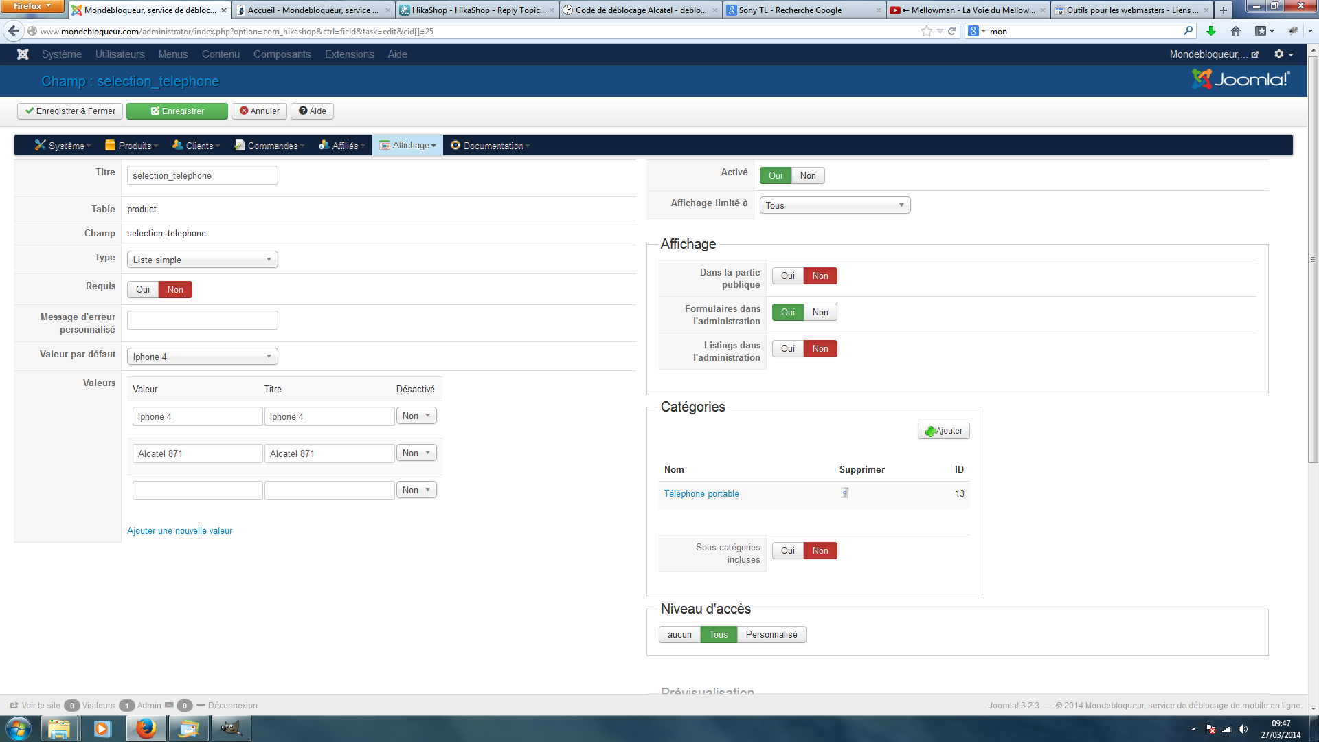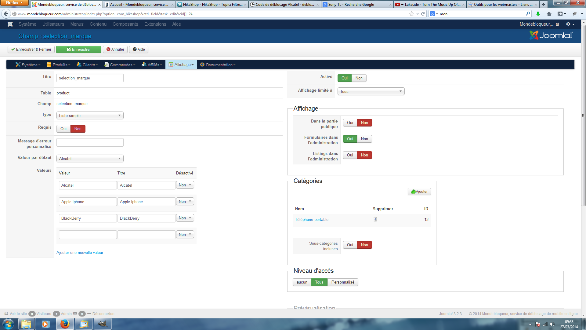 Pour faire cela, il va falloir d'abord créer deux champs personnalisés de la table "produit", un pour la sélection de la marque, un second pour la sélection du téléphone, avec toutes les valeurs possible pour chaque.