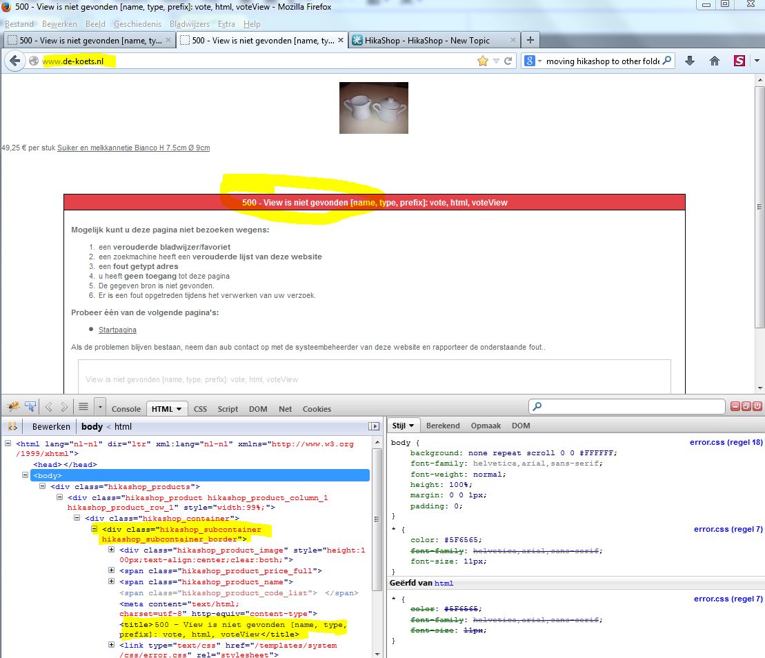 I made a website including the Hikashop component in a subfolder on the webserver. After the building was completed I wanted to move the complete website to the root. I copied and pasted all folders and files. I also changed the joomla config file path for the tmp and log. So the regular jobs when moving a joomla site. But the site comes with an eror at the frontend. 500-view not found. Backend works fine. I think this issue is occured by Hikashop because when I use Firebug I see Hikashop mentioned in the problem HTM. Please see attachment. I browsed to this Forum and the FAQ but could not find something to help me solve this problem.