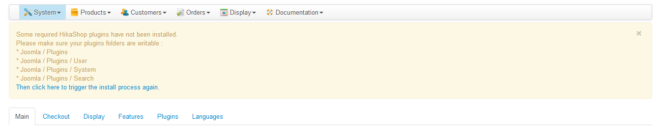 After install HikaShop and when the instalation goes to install the plugins it gives that error, I try to reinstall the plugins when I enter the configuracion menu that ask to install the misiing plugins and give the same error.