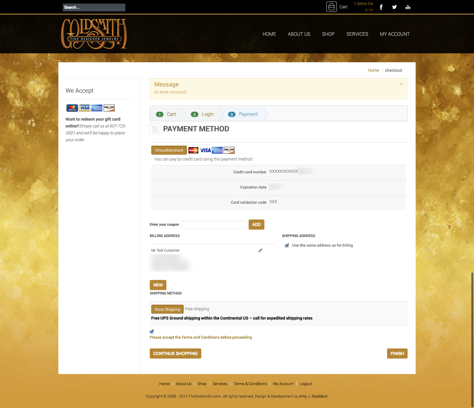 ) I can add it to the cart, (step 1), register/login (step 2 ) However, I get to the last step (step 3) in my checkout process, enter credit card information, I make sure the shipping address is fine and make sure the terms checkbox is selected and then click the "finish" button but nothing happens? The page just shows all the info I just entered with the "Finish" button in the bottom right hand corner of the page. When I click it I am still on the same page and I see a system message at the top that says "An Error Occurred"?