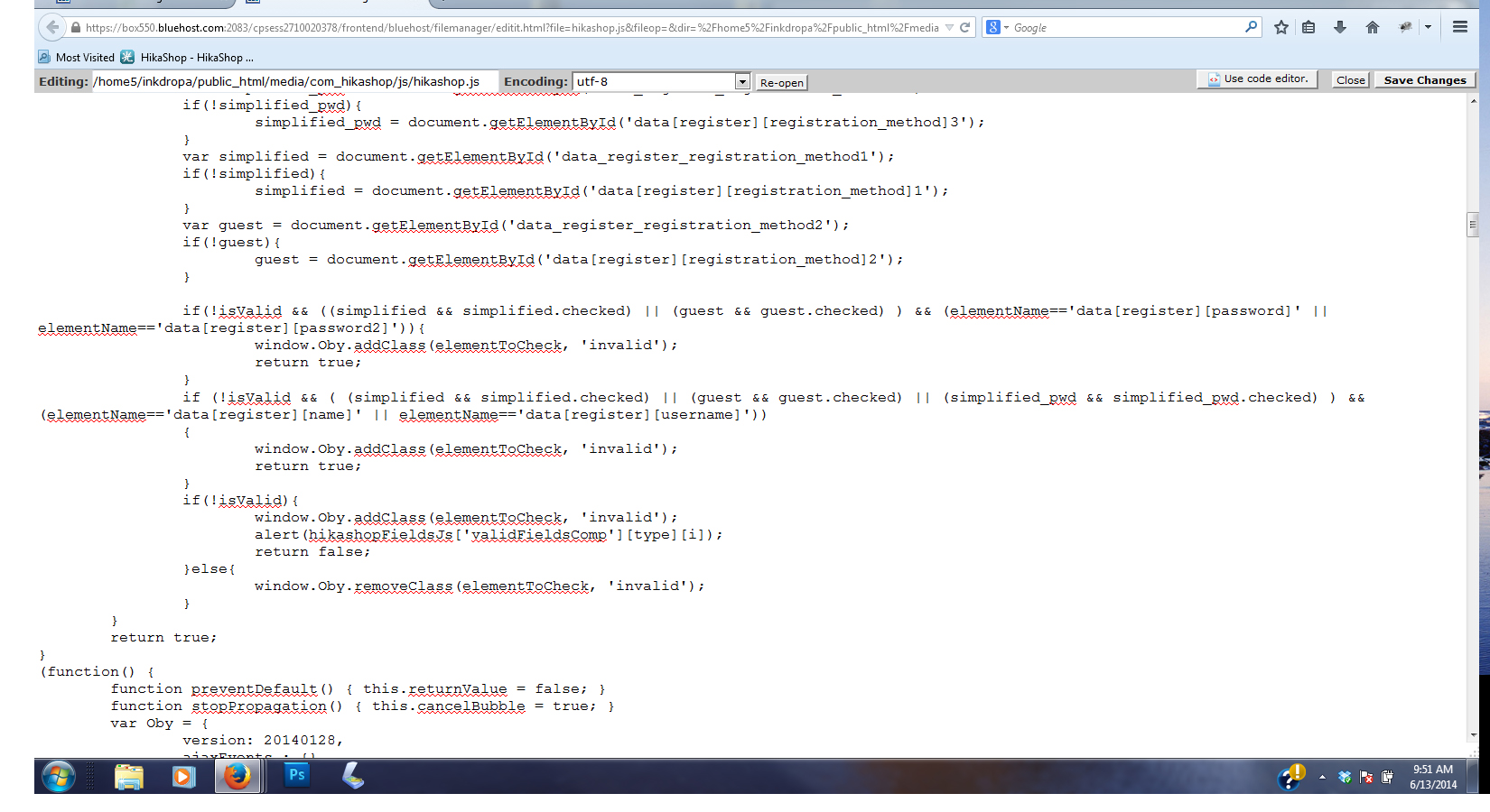 Just upgraded to latest HikaShop and now the checkout will not work properly. This is what happens: After adding to the cart, filling out the address hitting the next button it redirects to the home page. No error messages. I read in another post that it is a js issue. Not sure what to fix in the code so I made a screen shot for you to take a look and let me know what I need to change.