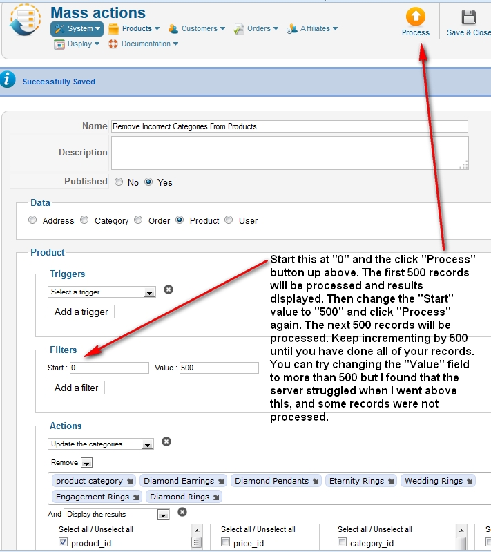 What you want instead is to have a products listing associated module, but configure its "sub element filter" option to "direct sub elements" instead of "all sub elements". That way it will display the products only if they are directly linked to the current category and thus they won't show on the first page, only once you select a category.