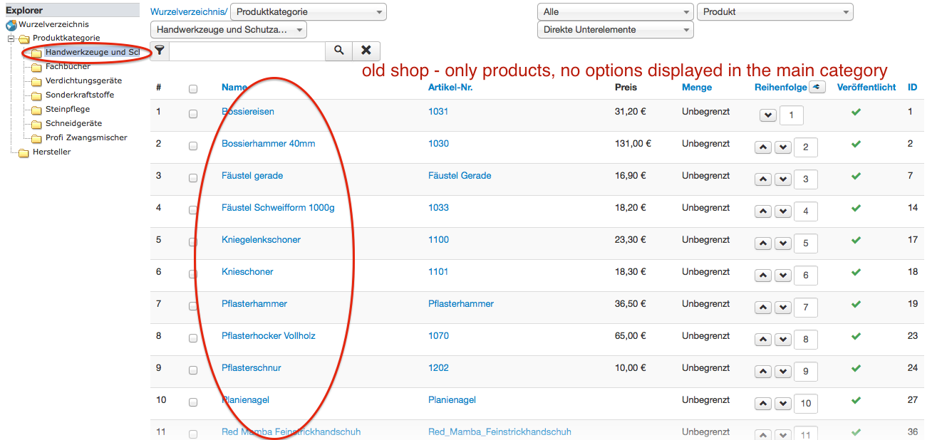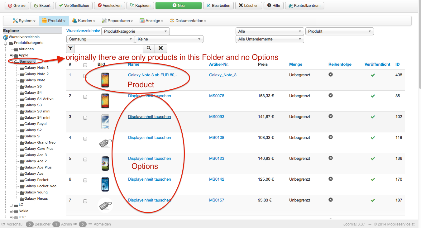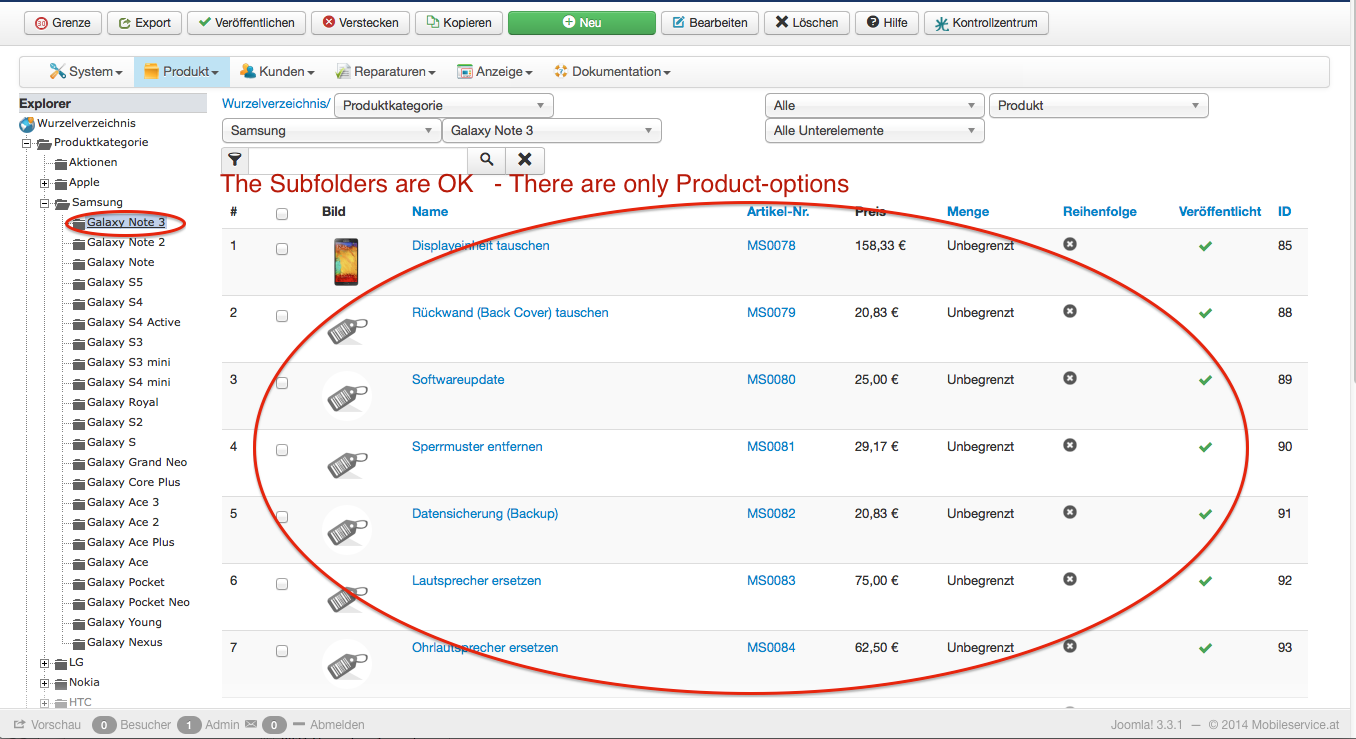 -- Error-message(debug-mod must be tuned on) -- : Hey guys, After i did the Update to the latest Joomla und Hikashop there are many problems in case of displaying Products in Categories und and Folder structure in Backend. Bevore i've done the Update everything went fine. Ich i add a new category and some Products they will be displayed perfectly. after i run the update any of my new created products is displayed. And the file structure of my products in Backend has complete changed. Now all Products with their options are in the main category folder... See Image before and after attached (different shops - on is updated and the other one is still the old version). Why are the options displayed in the category folder? I've created a path to subcategories (see picture)