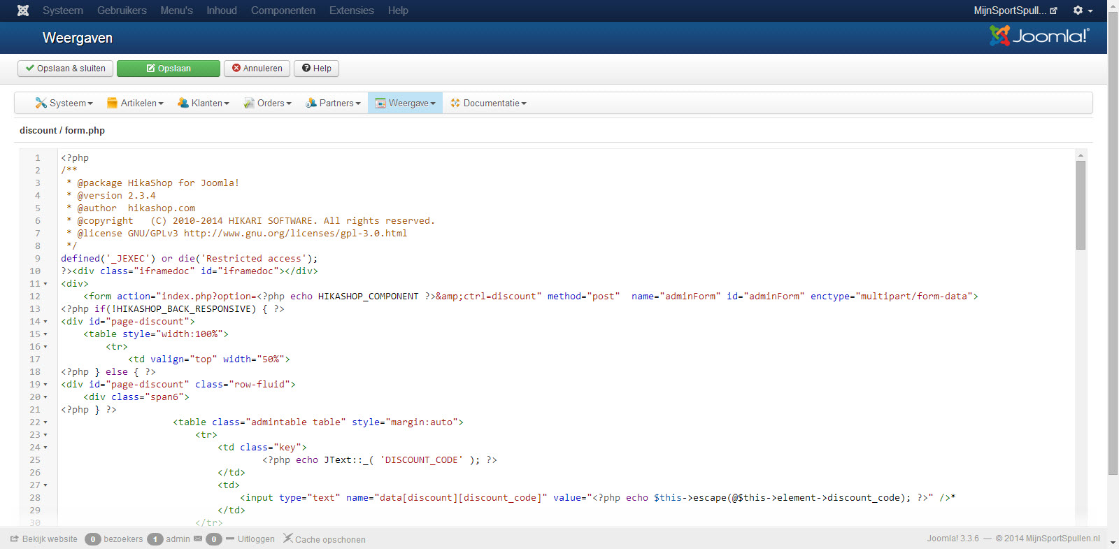 Please edit the view "discount / form"in backend template via the menu Display > Views and replace:
