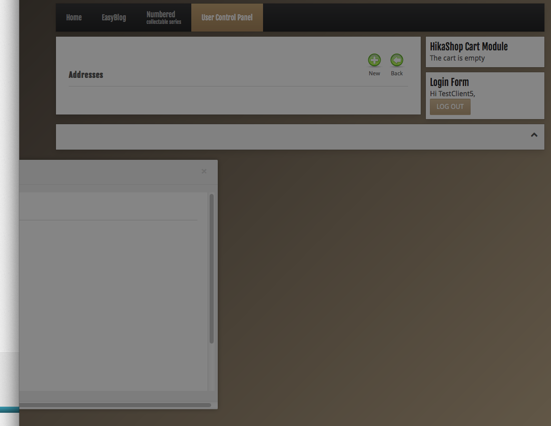 When clicking in the "New" button inside the Addresses Maanger form a Hikashop User menu panel I get this strange result: