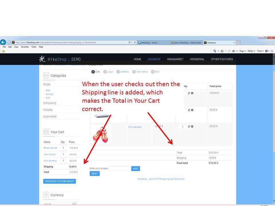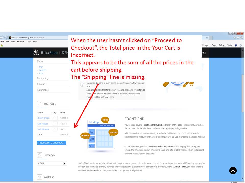 The Total in the Your Cart module (this was reproduced in the Hikashop demo site) is incorrect before the user clicks on the on the "Proceed to Checkout" button.