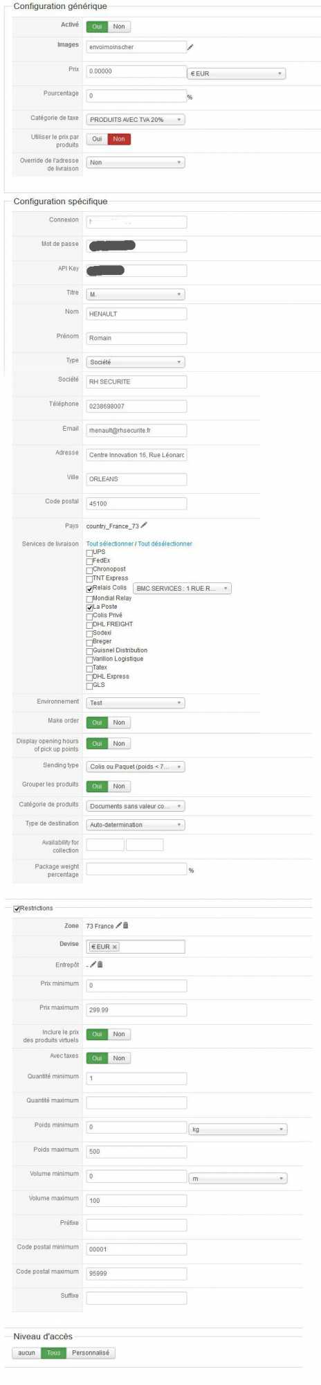 Pour envoimoinscher, j'ai saisi tous les paramètres nécéssaires, identifiants, clé, etc., choisi 2 services de livraison, environnement (j'ai essayé les 2, test et production), paramétrer les restrictions. La liste des catégories est disponible.