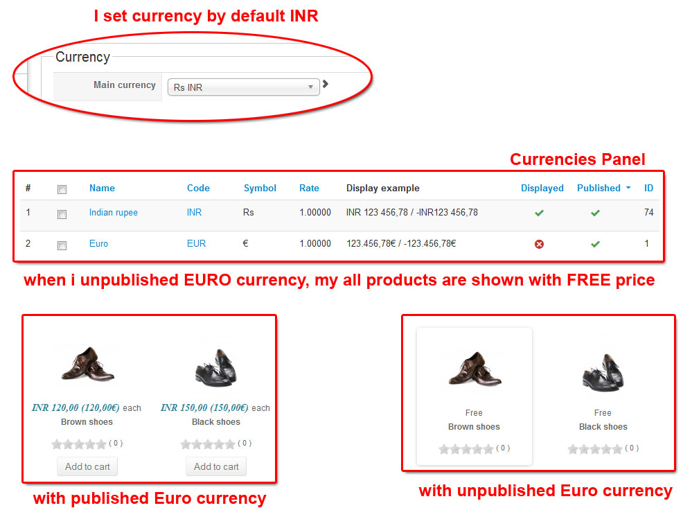 From what you're saying, it seems you want to show INR only by default. Means you'll need to set only INR to both "published" and "displayed".