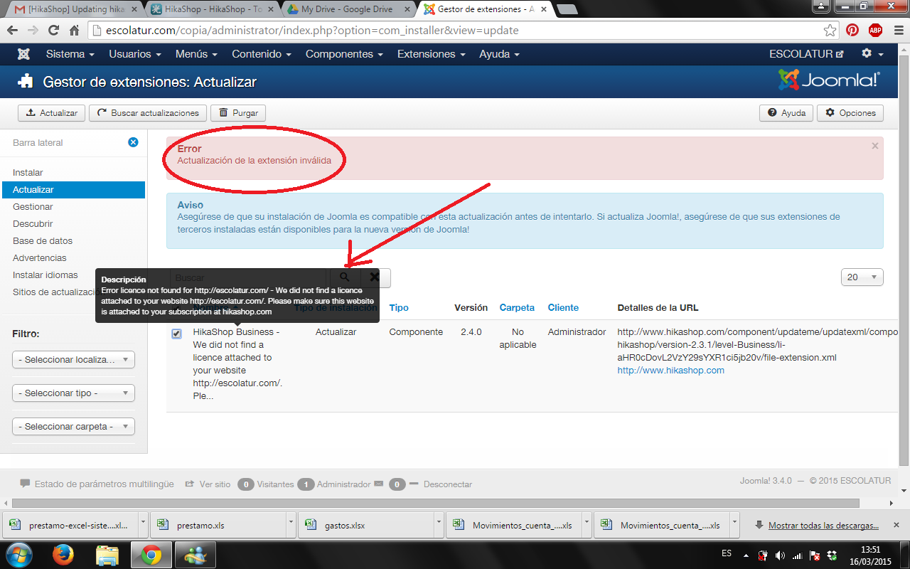 I'm updating de Hikasop version from 2.3.1 to 2.4.0 in a testing directory: mysite.com/copia.