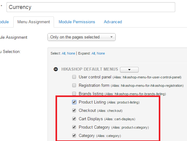 When I tell the module to only show the currency switcher on the Hikashop page items...then it doesn't display.