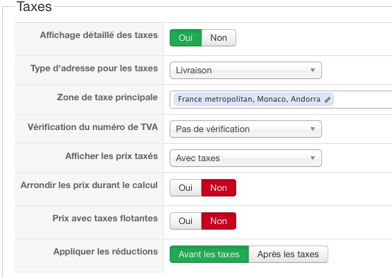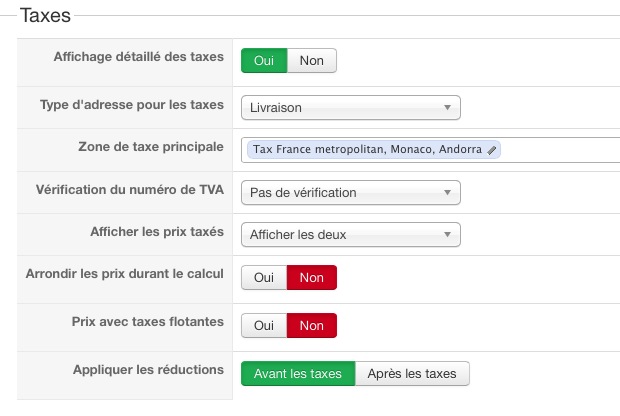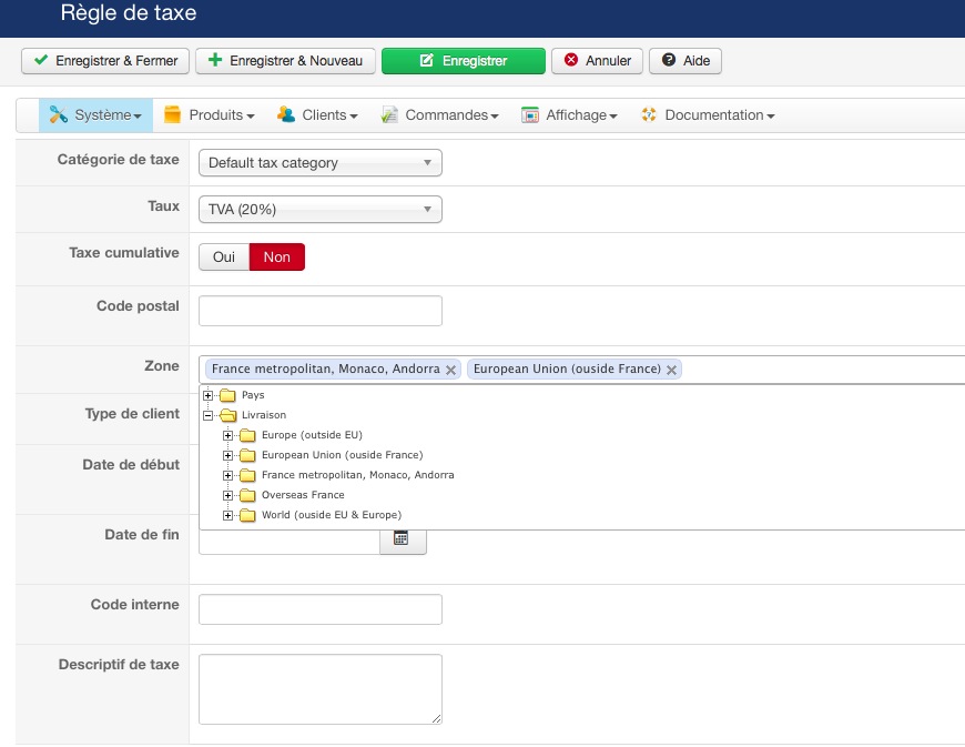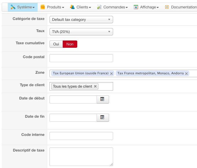 1 zone de taxe principale définie appartenant à la zone de taxe (Main tax zone : You need to select your zone here. Some countries might have different taxes on a per-state basis so you will want to specify here your state rather than your country. That parameter will be used to calculate taxes. Also, before a customer enters his address, the system will also use this zone as the customer zone to calculate taxes.)