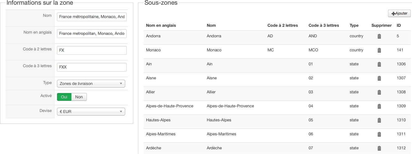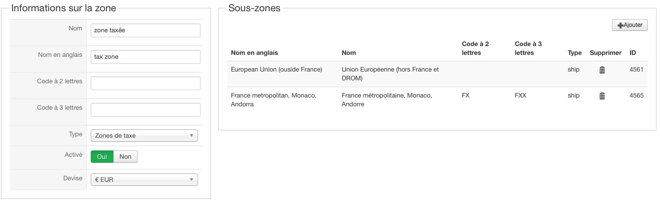 1 zone de livraison active (qui contient les mêmes départements que la zone de taxe).