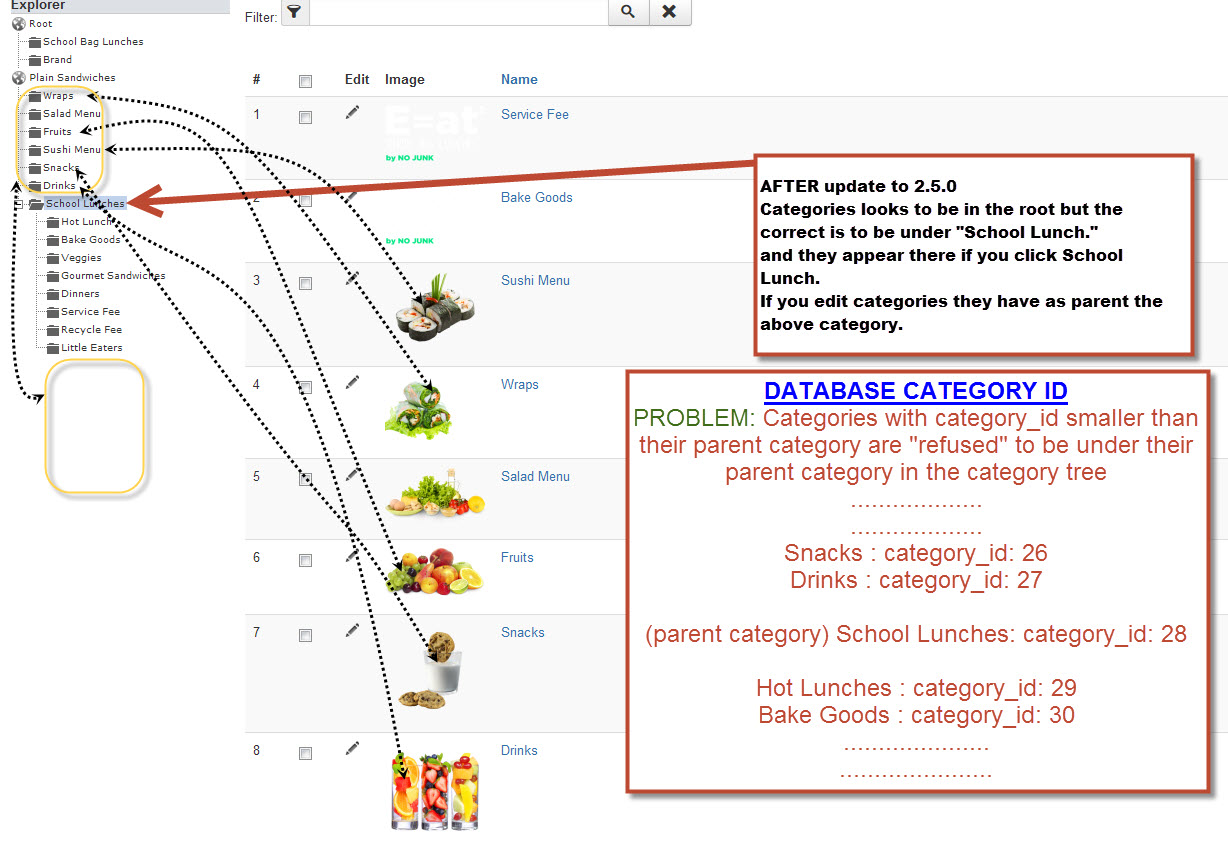 I think that the key for this problem is that the categories with "category_id" smaller than the parent category are "refused" to go under it in the tree.