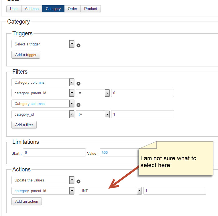 And with an action "update the values" on the column "category_parent_id" equal to 1.
