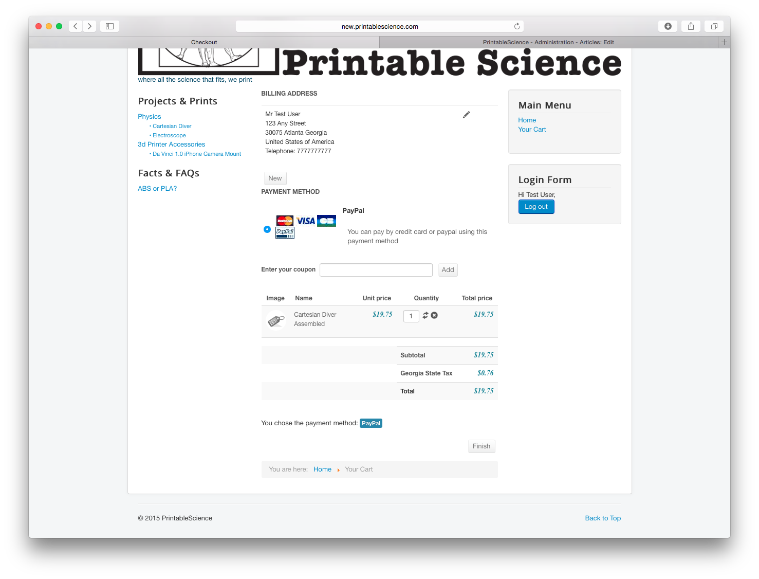 Cannot get to paypal from cart, pressing the Finish button in the cart raises the error.