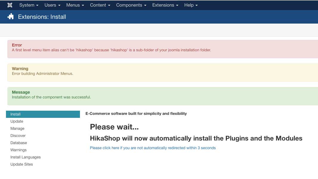 When I try to install HikaShop 2.6.0 I get error messages and no Hikashop appears in the Components menu in the back end.
