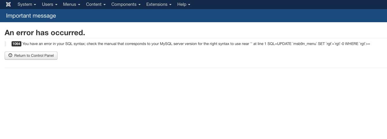 1064 You have an error in your SQL syntax; check the manual that corresponds to your MySQL server version for the right syntax to use near '' at line 1 SQL=UPDATE `msb9n_menu` SET `rgt`=`rgt`-0 WHERE `rgt`>="