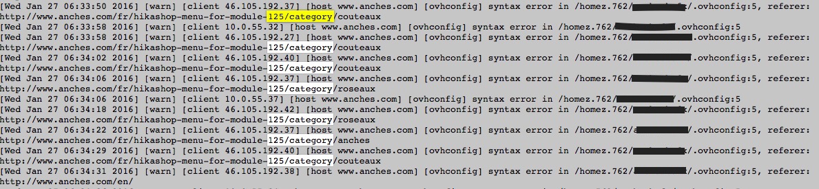 - Désactivez l'option "force canonical URLs on listings" dans la configuration HikaShop. Peut être que les URLs canoniques de vos catégories sont fausses.