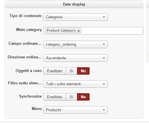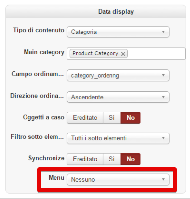 I notice something in your "Data Display", your Menu can't be "Nessuno"...but an item menu listing, so create a categories listing for your category or sub-category and select it, instead of "Nessuno".