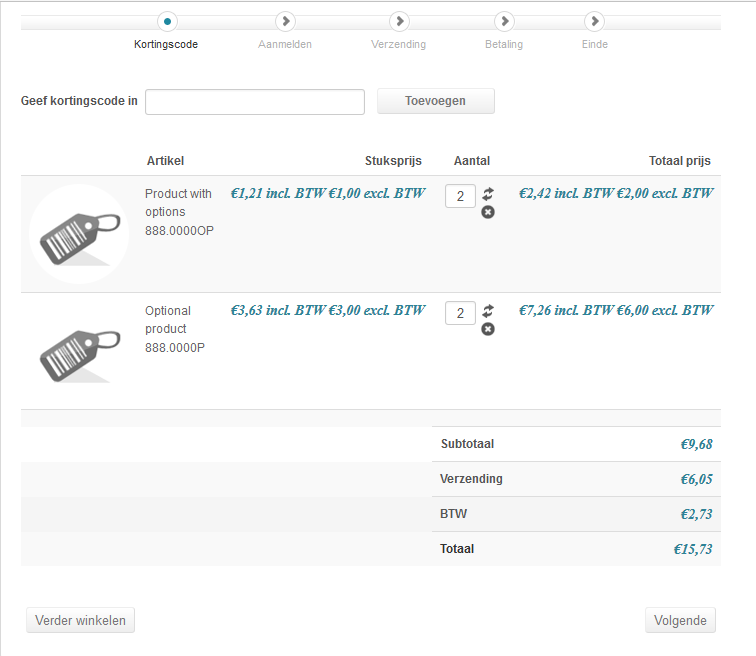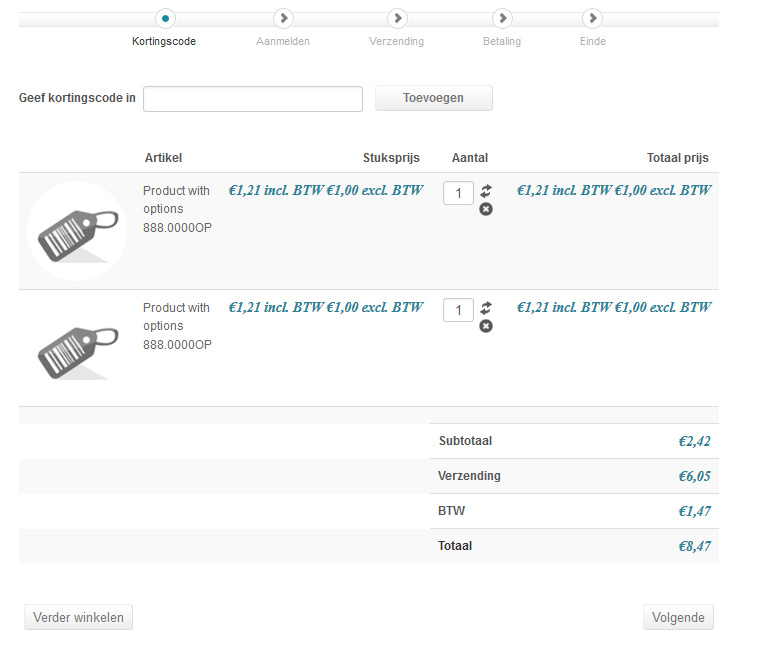If I order a product, with the same variants and options, and use the add to shopping cart button two times or more the product will be added to the shopping cart as two or more separate items.