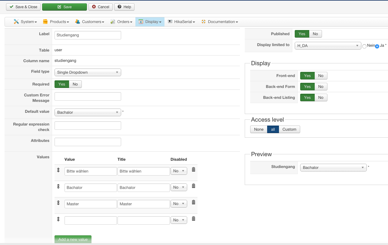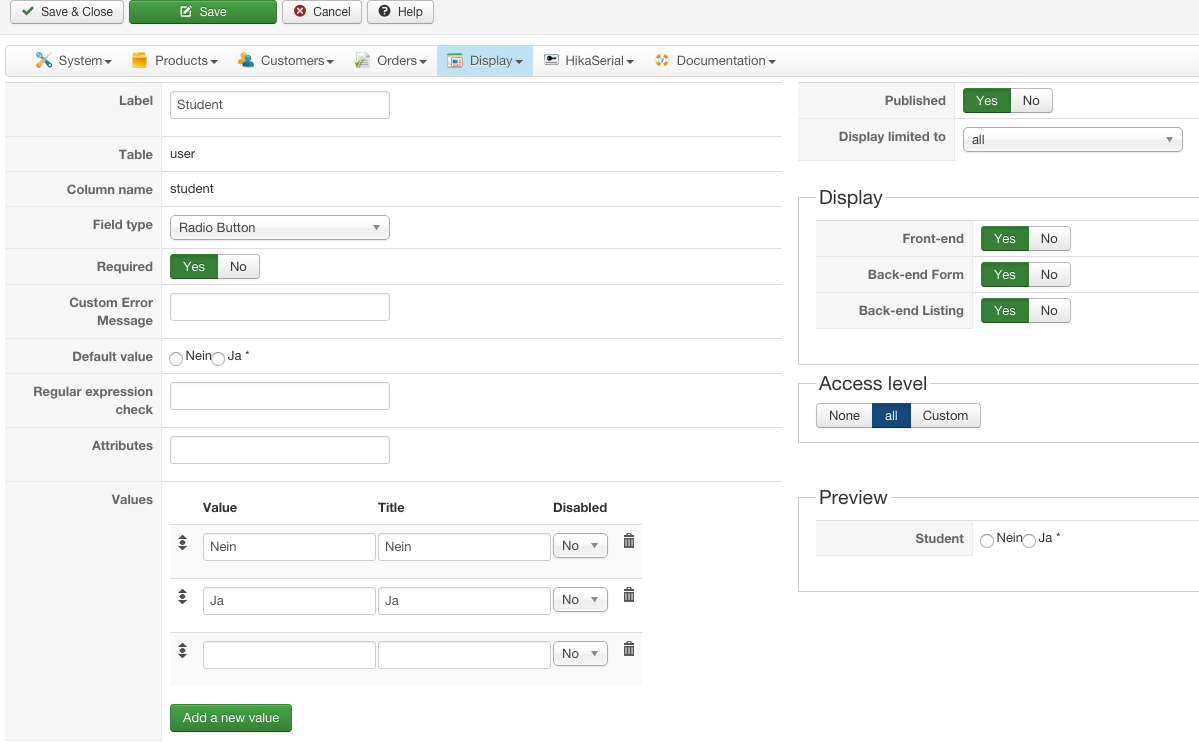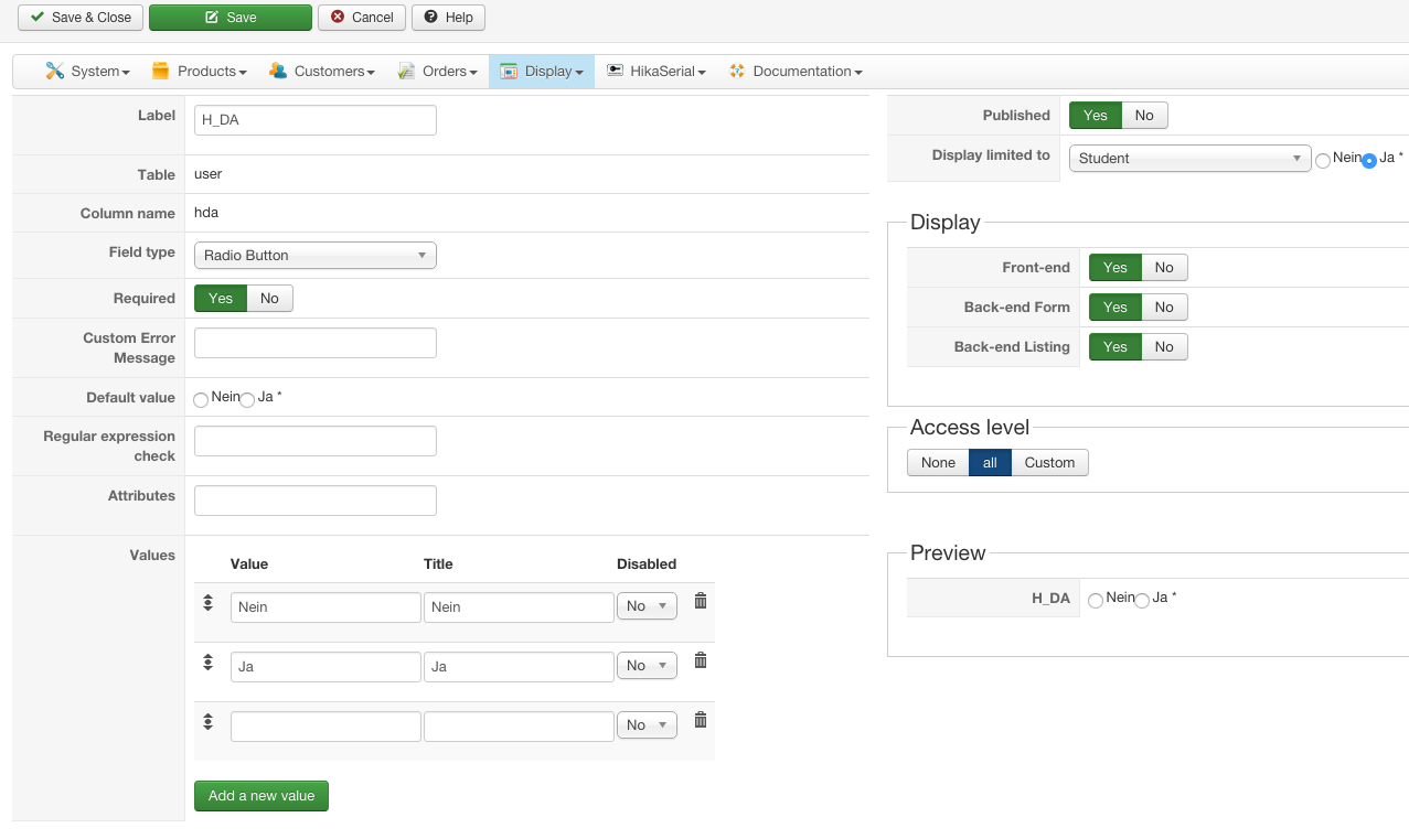 So i have a radiobutton group for "are you a student" yes /no. This is mandantory. I f yes then a second radiobutton group is/should be shown shown "university name hda" yes/no. After user clicks yes several other fields and dropdowns should be shown. So i setup these constrains like explained in the documentation of fields but all fields are always shown. For my understanding the second radiobutton group should show if the user selects in the first radio button group "yes" and if he selects yes in the second group the other fields that are dependent to the second radio button group should be shown.