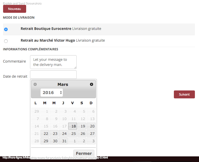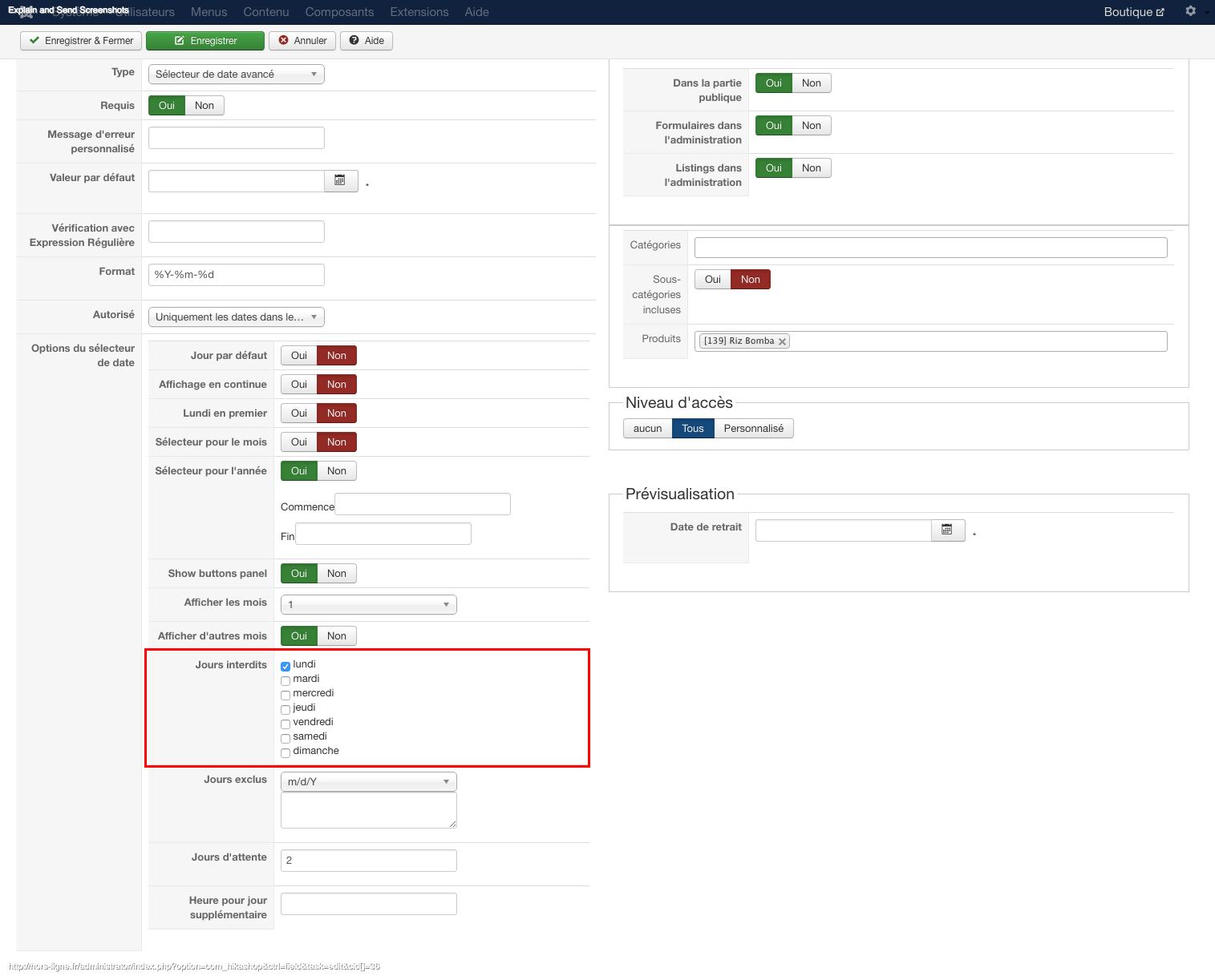 Cependant, le champ personnalisé "deliverydate" permet bien de cocher des "Jours interdits" (capture d'écran 1) pour un retrait en magasin.