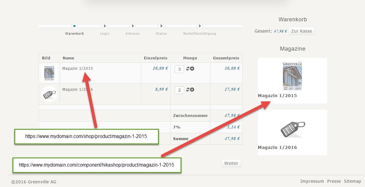 In the settings of your module, you need so select your "shop" menu item in the "menu" setting and you should get the same URL.