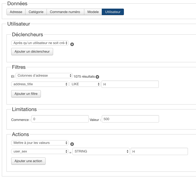 Si vous voulez faire une action de masse après la création de l'adresse, alors il faudrait utiliser le déclencheur correspondant (qui existe). Le problème que vous allez avoir dans ce cas, c'est que les actions de masse sur les adresses ne gère pour l'instant pas les actions sur les données utilisateur. C'est pour cela que Xavier vous propose une exécution périodique pour votre action de masse.