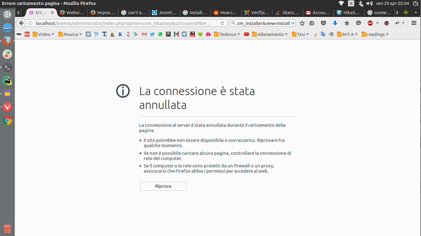 I just installed Hikashop, finally I don't have any installation error, I had permission problems so I put 777 on most folders, but now when I try to manage products, category, users, etc... I can't do anything, I get connectioninterrupted error (I'm in localhost).