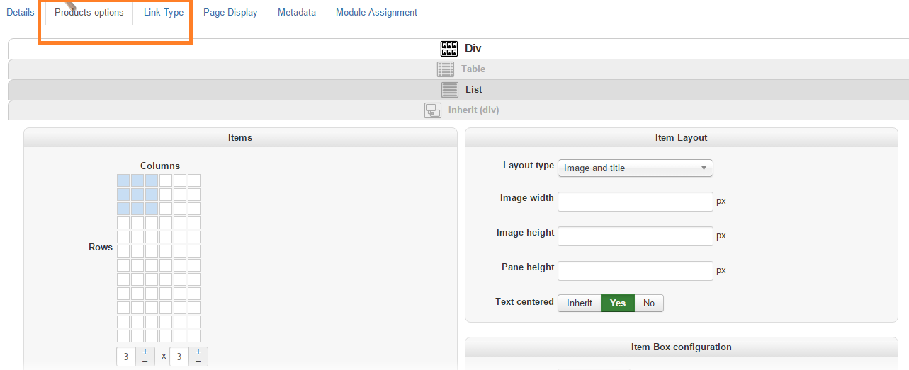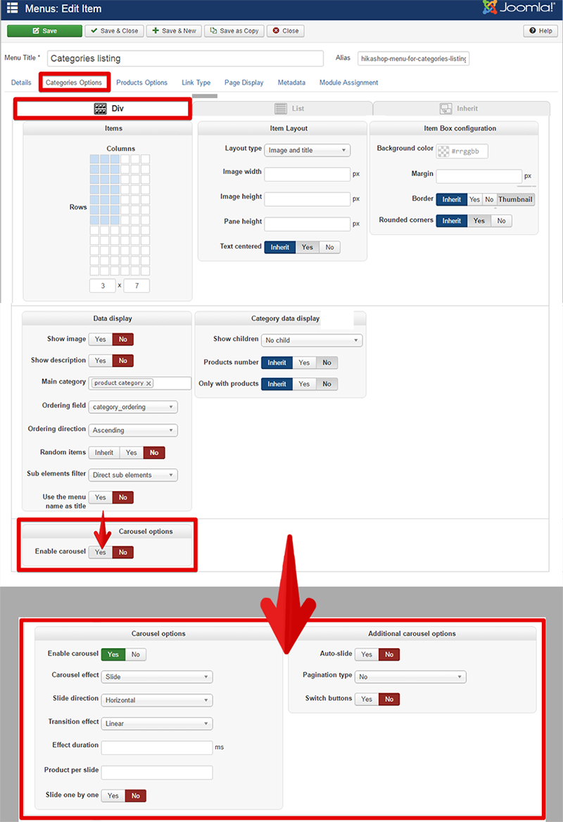 You can get your Carroussel Options only in Categories Options and for Div display mode, see the screenshot :