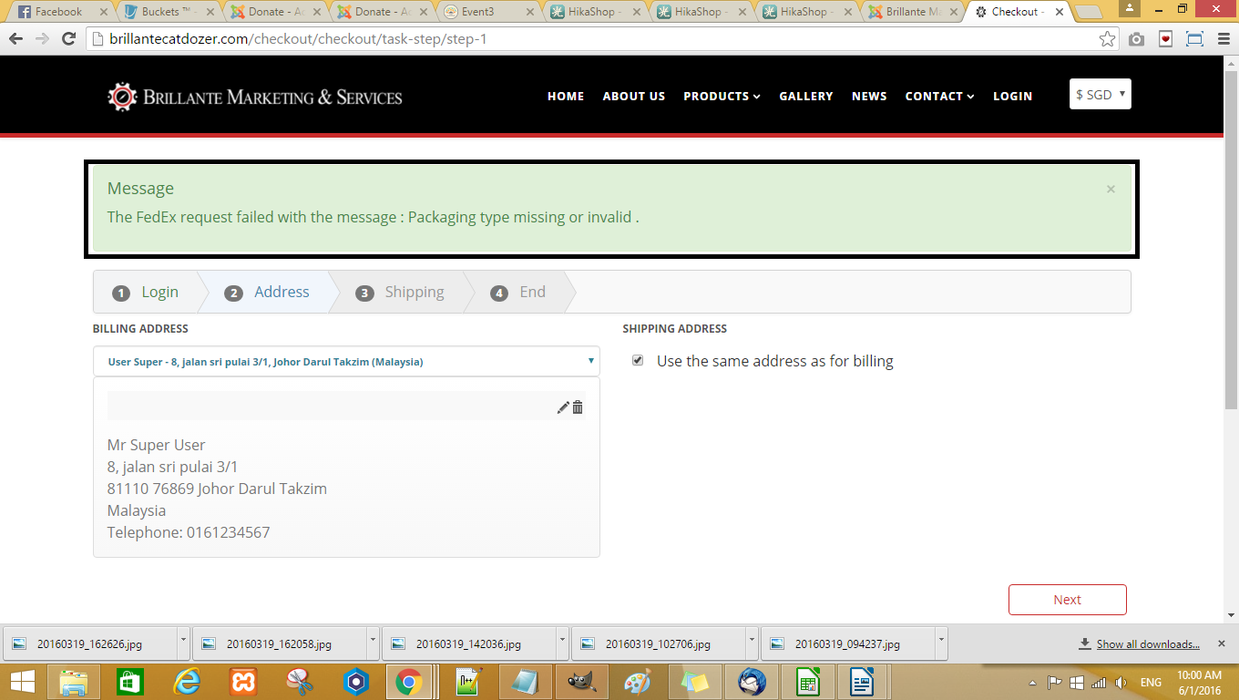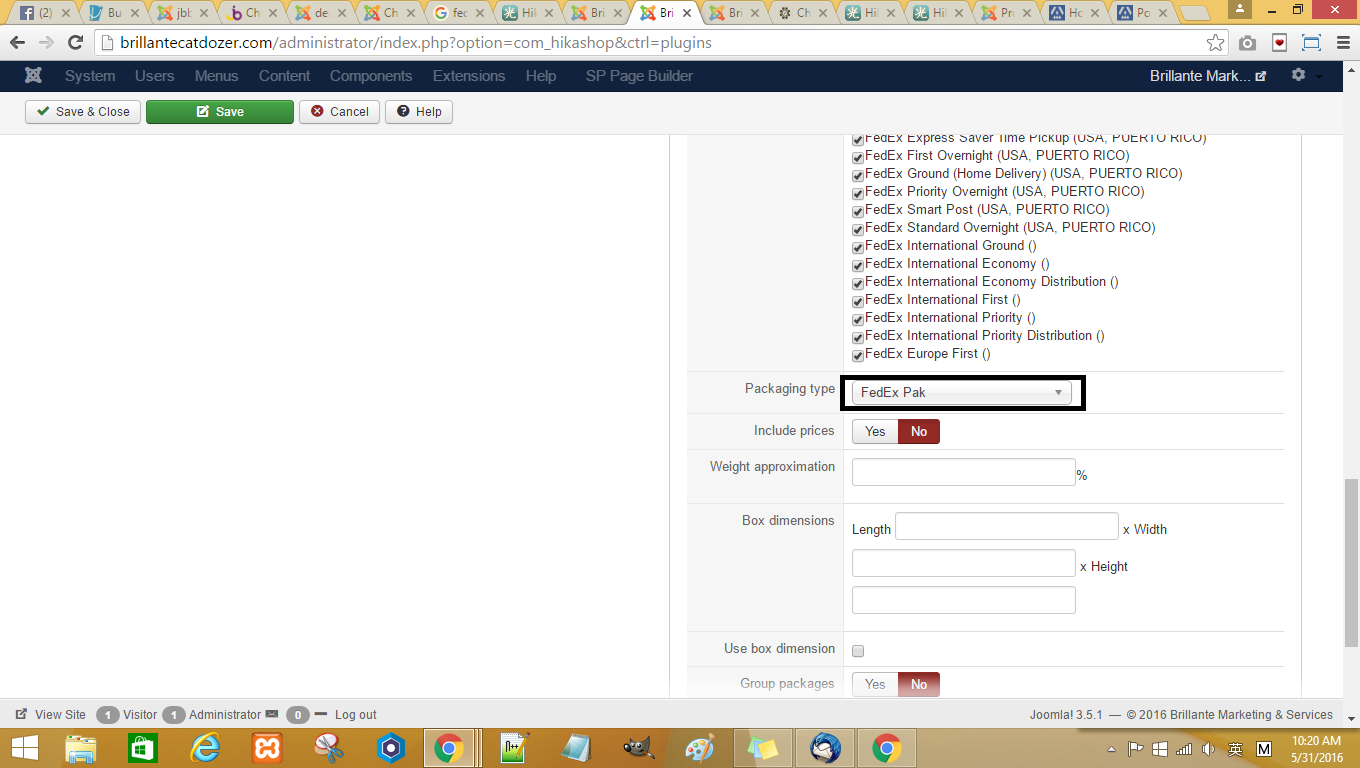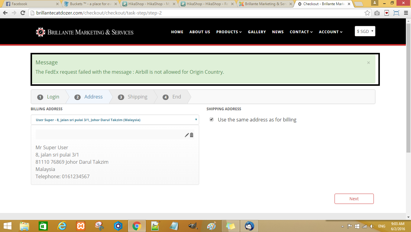 I select option your packaging , it will display message Airbill is not allowed for Origin Country. If i select options FedEx Box or FedEx Pak or FedEx Tube , it will display error message Packaging type missing or invalid.