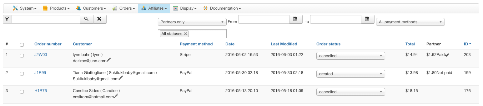 None of the partner orders that you have on your second screenshot are confirmed. They are either cancelled or created. That means that you didn't get any money for these sales. So you don't want to give any affiliate fees to your partners, right ?