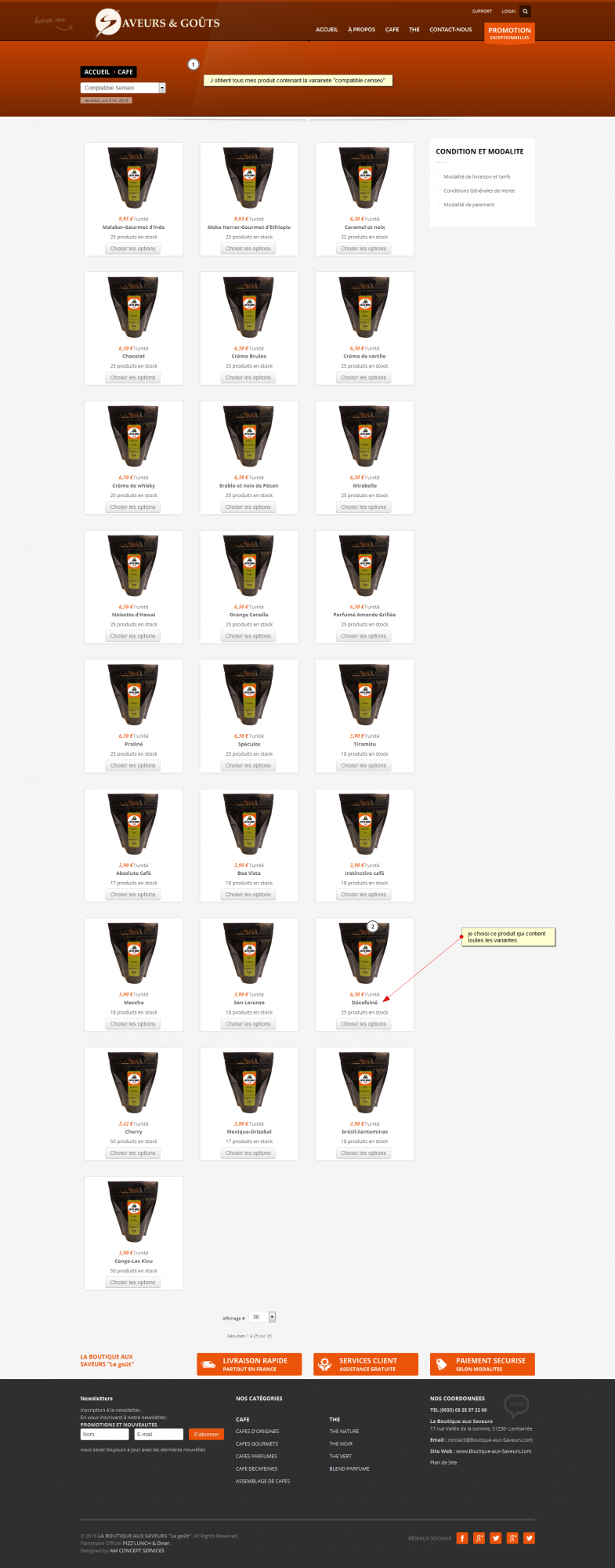 Pourquoi avoir des variantes sur vos produits pour le type de café ? Vous pourriez avoir seulement la caractéristique sur le poids et 4 produits différents pour chaque produit que vous avez actuellement.