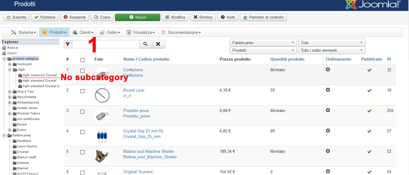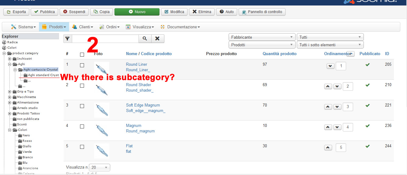 2)This is very strange things, in prduct view If I select the category "Aghi" I see 3 subcategory (second image) with no subcategory, but if I slect the category "Aghi cartuccia crystal" (3rd image ) by the graph it seems there is other subcategory, even if that category doesn't have any subcateogry.