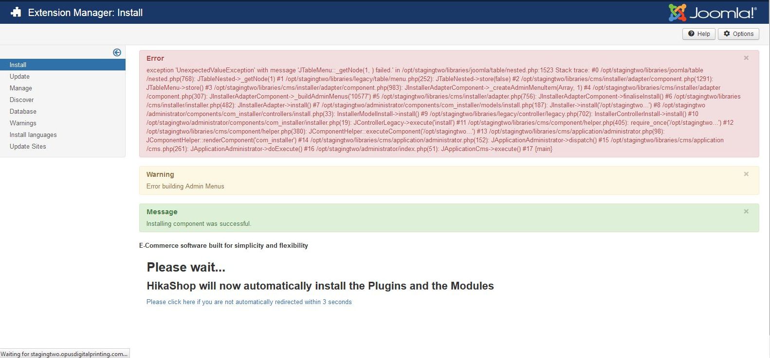 We have just tried to do an update on an existing Hikashop install and the component seems to have been installed correctly, but the admin menus are not building properly.