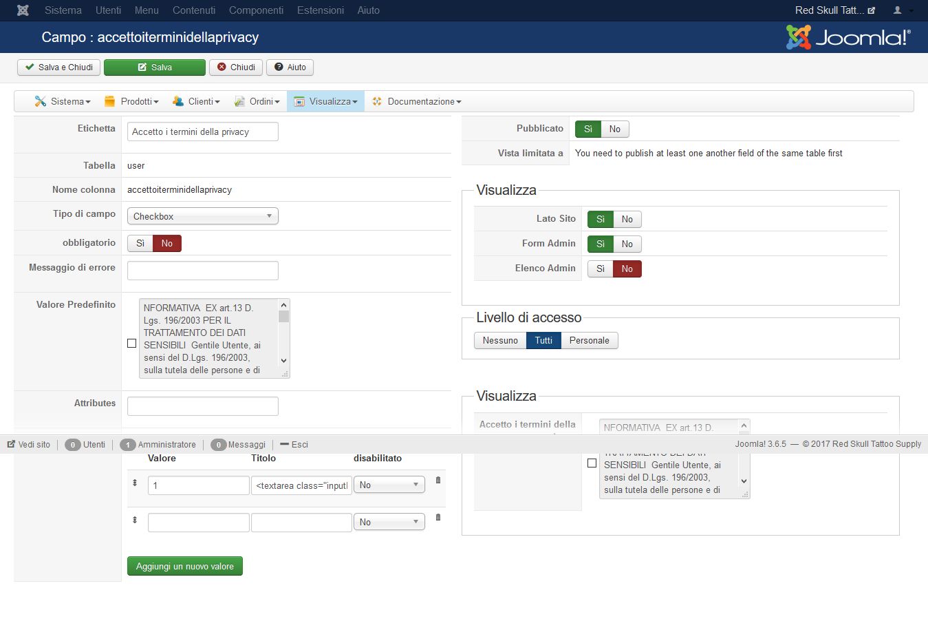 Unknown column 'privacy' in 'field list' SQL=UPDATE `#__hikashop_user` SET `user_email`='signorilef@libero.it',`user_cms_id`='84',`accettoiterminidellaprivacy`='1',`privacy`='NFORMATIVA EX art.13 D. Lgs. 196/2003 PER IL TRATTAMENTO DEI DATI SENSIBILI Gentile Utente, ai sensi del D.Lgs. 196/2003, sulla tutela delle persone e di altri soggetti rispetto al trattamento dei dati personali, il trattamento delle informazioni che La riguardano, sarà improntato ai principi di correttezza, liceità e trasparenza e tutelando la Sua riservatezza e i Suoi diritti. In particolare, i dati idonei a rivelare l\'origine razziale ed etnica, le convinzioni religiose, filosofiche o di altro genere, le opinioni politiche, l\'adesione a partiti, sindacati, associazioni od organizzazioni a carattere religioso, filosofico, politico o sindacale, nonché i dati personali idonei a rivelare lo stato di salute e la vita sessuale, possono essere oggetto di trattamento solo con il consenso scritto dell\'interessato e previa autorizzazione del Garante per la protezione dei dati personali (articolo 26). Ai sensi dell\'articolo 13 del predetto decreto, Le forniamo quindi le seguenti informazioni. 1. I dati sensibili da Lei forniti verranno trattati, nei limiti dell\'Autorizzazione generale del Garante, per le seguenti finalità: fatturazione e spedizione; 2. Il trattamento sarà effettuato con le seguenti modalità: informatizzato; 3. Il conferimento dei dati è obbligatorio e l\'eventuale rifiuto a fornire tali dati può comportare la non prosecuzione dell\'ordine. 4. I dati non saranno comunicati ad altri soggetti né saranno oggetto di diffusione 5. Il titolare del trattamento è: Red Skull Tatoo Supply 6. Il responsabile del trattamento è Red Skull Tatoo Supply; 7. il rappresentante del titolare nel territorio dello Stato è Red Skull Tatoo Supply; 8. In ogni momento potrà esercitare i Suoi diritti nei confronti del titolare del trattamento, ai sensi dell\'articolo 7 del D.lgs.196/2003, che per Sua comodità riproduciamo integralmente: Decreto Legislativo n.196/2003, Art. 7 - Diritto di accesso ai dati personali ed altri diritti 1. L\'interessato ha diritto di ottenere la conferma dell\'esistenza o meno di dati personali che lo riguardano, anche se non ancora registrati, e la loro comunicazione in forma intelligibile. 2. L\'interessato ha diritto di ottenere l\'indicazione: a) dell\'origine dei dati personali; b) delle finalità e modalità del trattamento; c) della logica applicata in caso di trattamento effettuato con l\'ausilio di strumenti elettronici; d) degli estremi identificativi del titolare, dei responsabili e del rappresentante designato ai sensi dell\'articolo 5, comma 2; e) dei soggetti o delle categorie di soggetti ai quali i dati personali possono essere comunicati o che possono venirne a conoscenza in qualità di rappresentante designato nel territorio dello Stato, di responsabili o incaricati. 3. L\'interessato ha diritto di ottenere: a) l\'aggiornamento, la rettificazione ovvero, quando vi ha interesse, l\'integrazione dei dati; b) la cancellazione, la trasformazione in forma anonima o il blocco dei dati trattati in violazione di legge, compresi quelli di cui non è necessaria la conservazione in relazione agli scopi per i quali i dati sono stati raccolti o successivamente trattati; c) l\'attestazione che le operazioni di cui alle lettere a) e b) sono state portate a conoscenza, anche per quanto riguarda il loro contenuto, di coloro ai quali i dati sono stati comunicati o diffusi, eccettuato il caso in cui tale adempimento si rivela impossibile o comporta un impiego di mezzi manifestamente sproporzionato rispetto al diritto tutelato. 4. L\'interessato ha diritto di opporsi, in tutto o in parte: a) per motivi legittimi al trattamento dei dati personali che lo riguardano, ancorché pertinenti allo scopo della raccolta; b) al trattamento di dati personali che lo riguardano a fini di invio di materiale pubblicitario o di vendita diretta o per il compimento di ricerche di mercato o di comunicazione commerciale.' WHERE `user_id`='31'