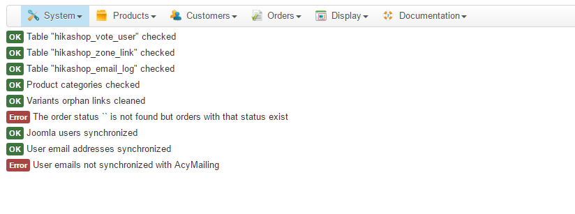 About the second message, please edit the hikashop/acymailing plugin and replace the line