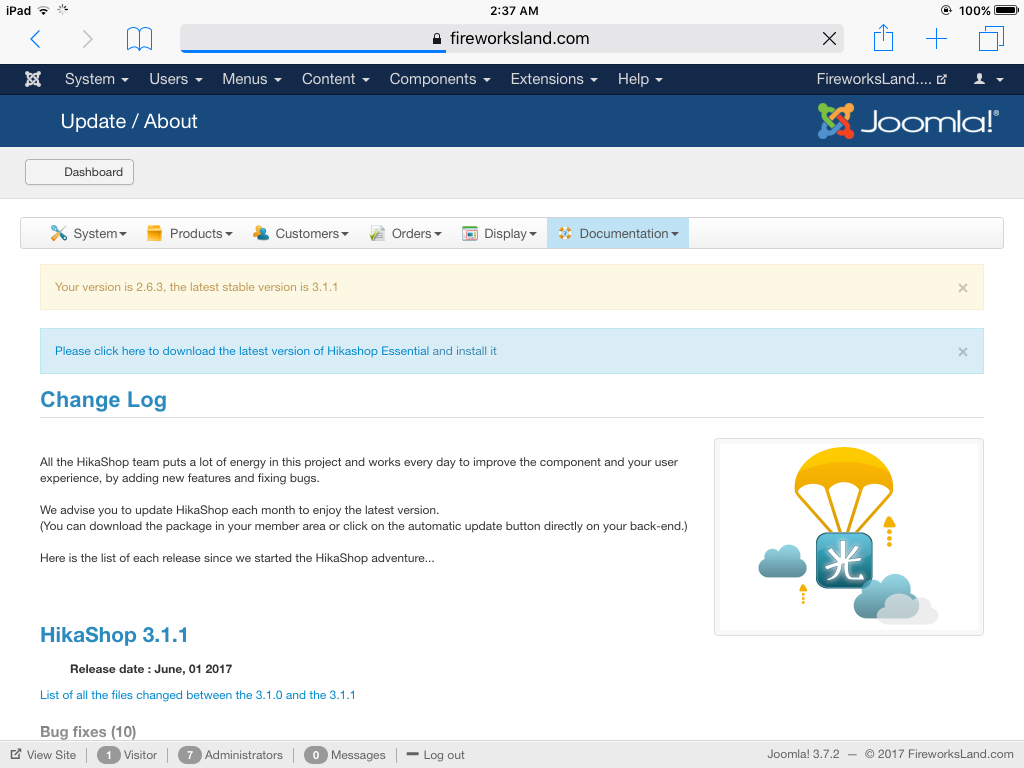 However when I go to the Hikashop administrator on my site, and click on Update/About, the automatic updater does not show. Instead, it simply says, "Please click here to download the latest version of Hikashop Essential and install it."