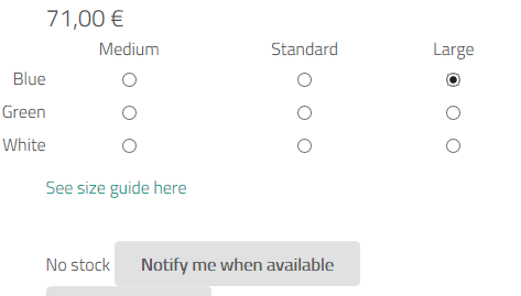 And you'll be able to see which ones are in stock and which ones aren't if you have the "Display out of stock products" setting turned off in the HikaShop configuration as only the cells with enough stock will have the radio selector and the variants without stock will have an icon instead showing that the choice is not available.